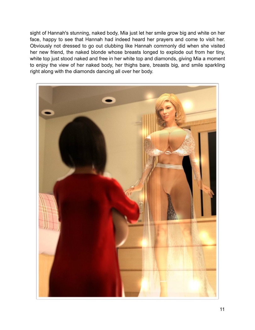 Yet unlike many of Hannah's lovers who get merely get sexy boosts in breast size and beauty, Mia became something of an experiment in the eyes of the teenage god. Hannah seemed to go all out on the sexual enhancements of the timid babe, giving Mia a body even more outrageous than her own. With far larger breasts and a far tighter stomach than even God herself, Mia quickly fell in love with the side effects that came with having sex with Hannah and started to forget about her studies. Encouraged by Sabrina, Mia started posting sexy pics of her new body on the internet for the world to enjoy, sending Mia skyward towards a celebrity status she simply was not prepared for. Yet despite the fact that now every man on campus begged for the sensationally sex Mia to be their girlfriend thanks to her fabulous new body, Mia prayed for Hannah to return to her and be her lover, wishing that Hannah would appear before her and make love to her yet again. The poor girl was forever corrupted by sex with the gods, wondering if one day she would get to become one as well.